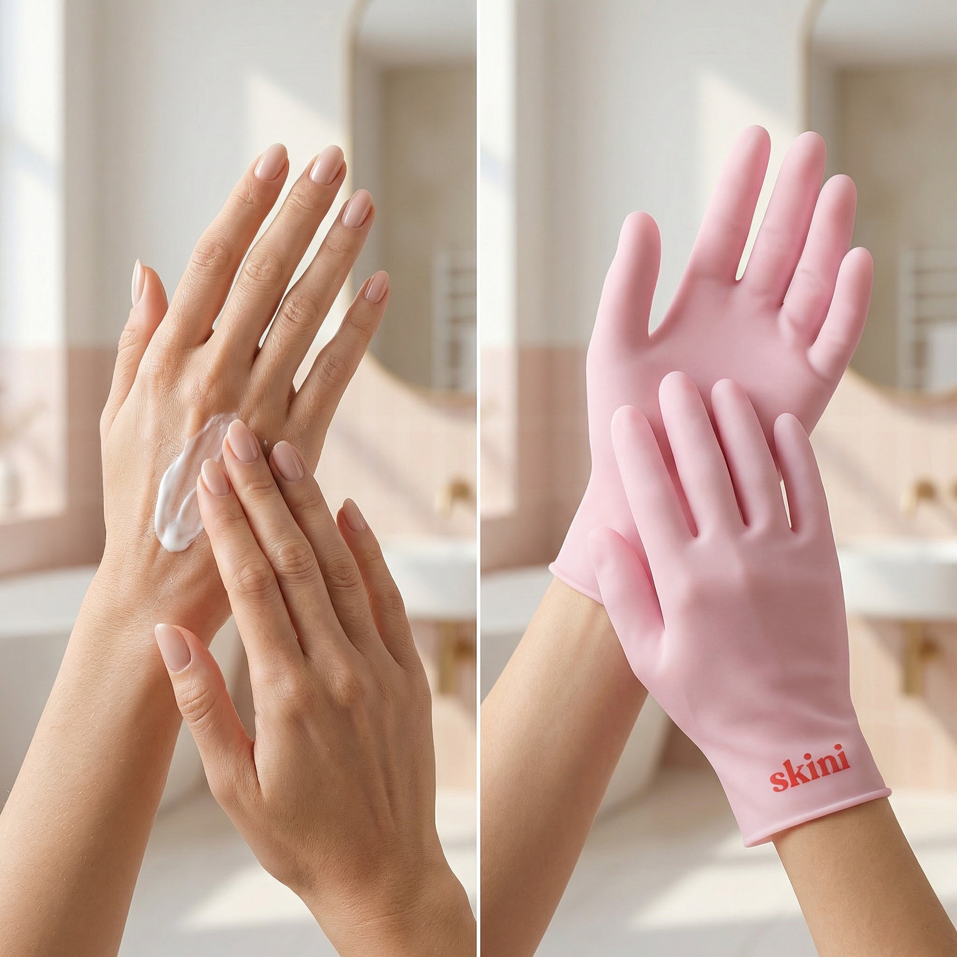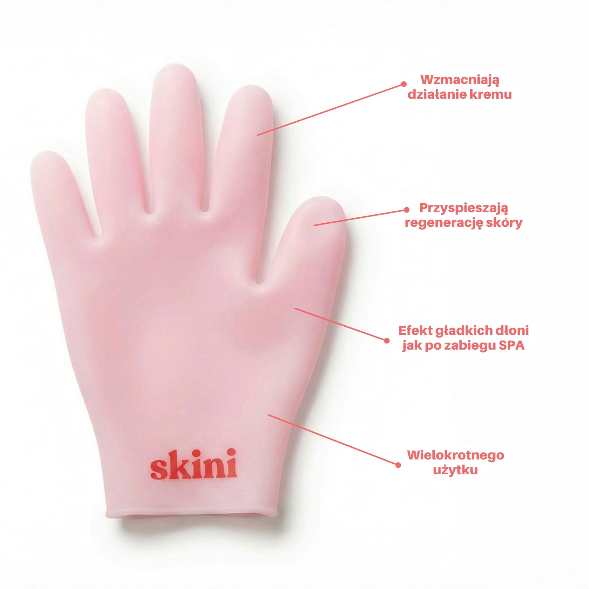 Nałóż ulubiony krem na dłonie, załóż rękawice Skini i pozwól im działać. Silikon tworzy efekt okluzji, który zatrzymuje wilgoć i wspomaga głębsze wchłanianie składników aktywnych.