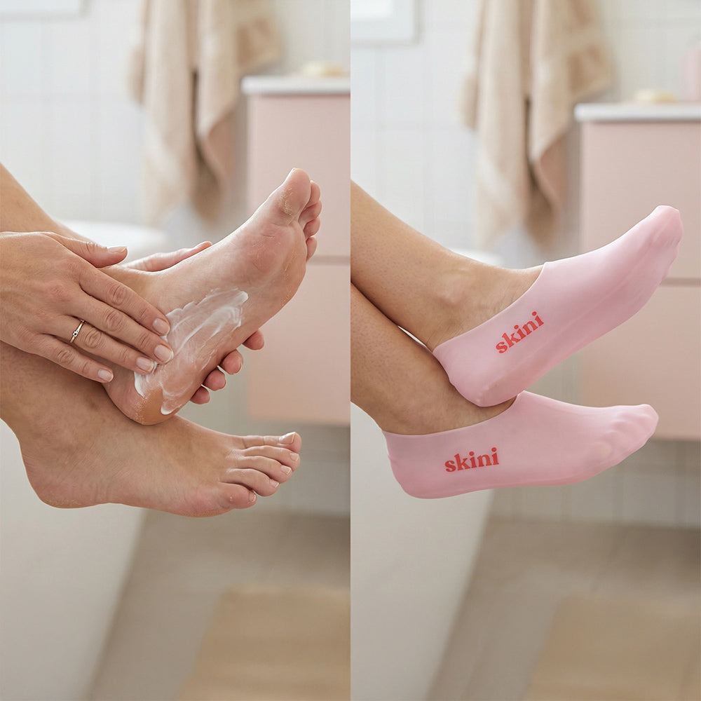 Nałóż ulubiony krem na stopy, załóż skarpety Skini i pozwól im działać. Silikon tworzy efekt okluzji, który zatrzymuje wilgoć i wspomaga głębsze wchłanianie składników aktywnych.