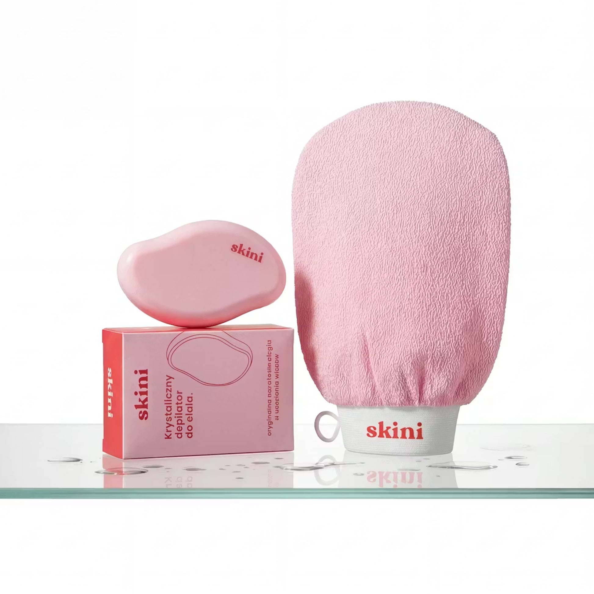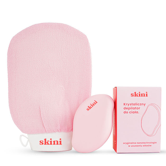 Zestaw bestsellerowych produktów od SKINI. Rękawica peelingująca SKINI oraz depilator z nanokryształu. Zestaw poprawia wygląd i kondycję skóry.